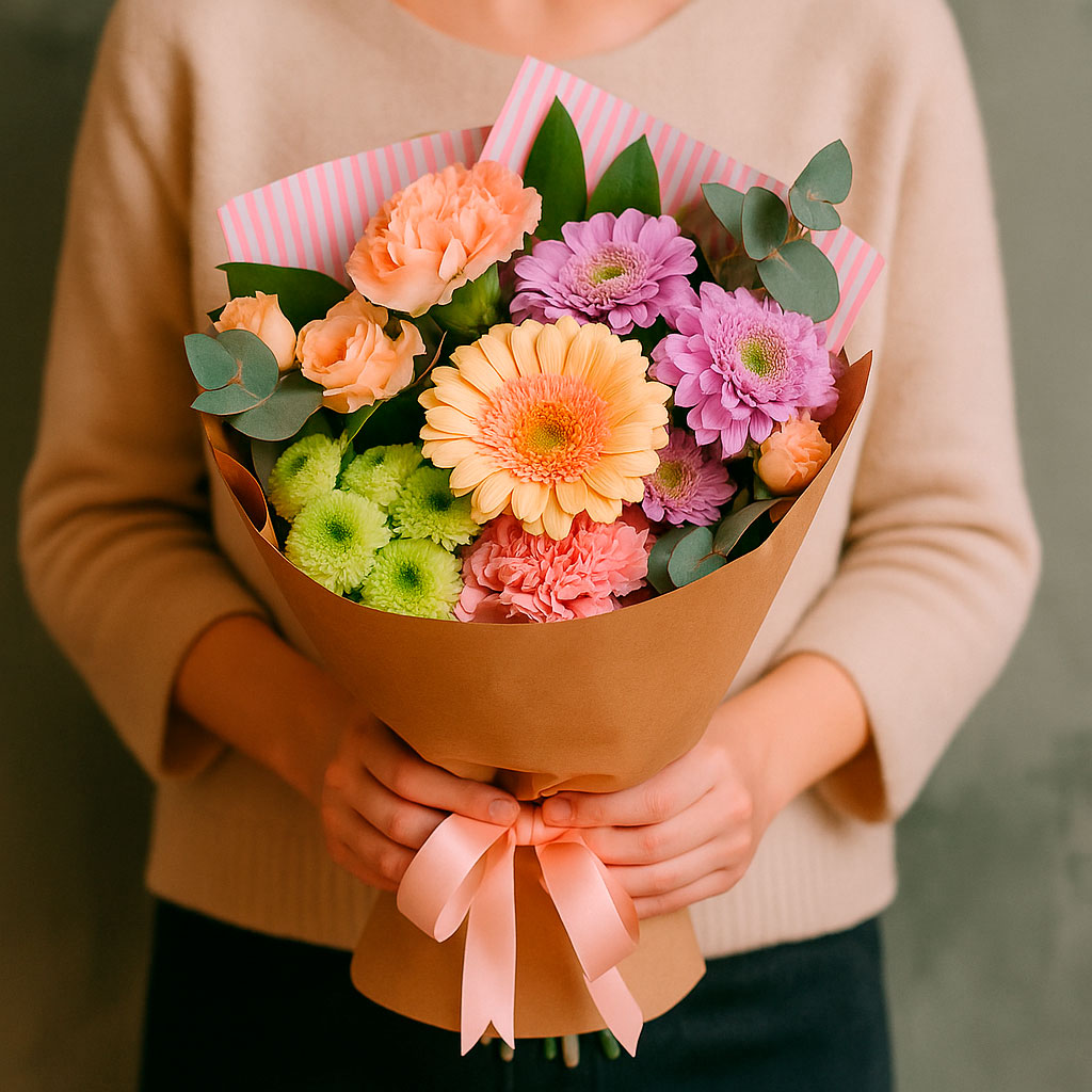 Кремовая гербера, зеленая и сиреневая хризантема кустовая, розовая гвоздика, кустовая роза и эвкалипт создают гармоничную композицию. Букет оформлен в крафт-бумагу и перевязан нежной розовой лентой. Альтернативно можно использовать матовую плёнку или декоративную сетку. Подходит для подарка на день рождения для любимой.