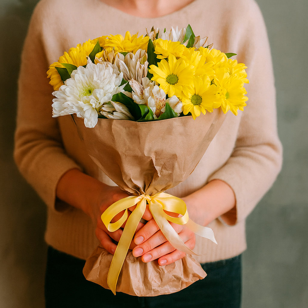 Белоснежные одноголовые хризантемы, жёлтые кустовые хризантемы и изящные белые альстромерии создают яркий и нежный ансамбль. Букет перевязан жёлтой атласной лентой и упакован в крафт-бумагу. Альтернативные варианты упаковки: матовая плёнка или декоративная сетка. Прекрасный выбор для поздравления на день рождения или для любимой.