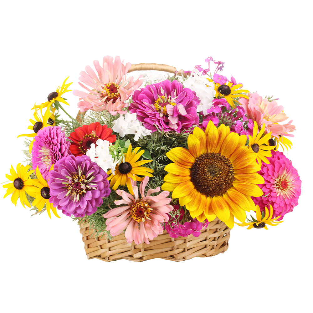 Яркая цветочная композиция из циний лунного камня, подсолнухов, астр микс в розовых оттенках, белых флоксов и красных гербер, дополненная свежей зеленью, создаёт атмосферу радости и тепла. Корзина из натурального материала подчёркивает естественность и красоту цветов. Возможны альтернативы оформления: корзина из ротанга или с тканевой отделкой. Прекрасный подарок для мамы на день рождения или для украшения летнего праздника.