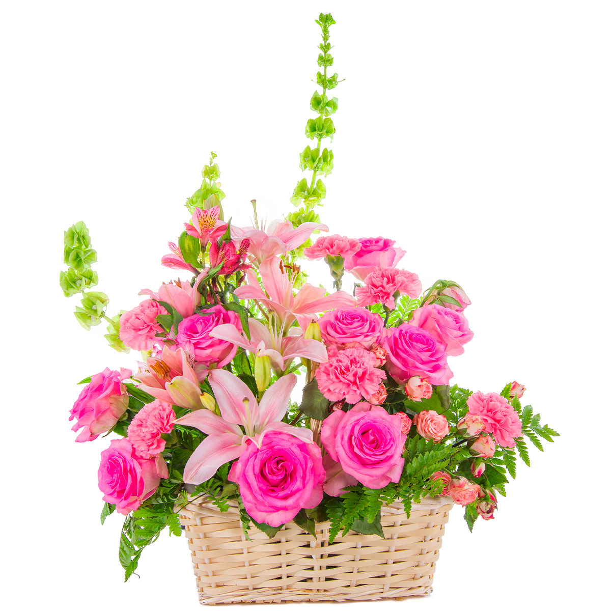 Розовые розы, кустовые розы, гвоздики, лилии и альстромерии создают гармоничную композицию в плетёной корзине. Эта корзина из лозы подчёркивает нежность и изящество цветов. Возможны варианты оформления в корзине из ротанга или с тканевой отделкой. Прекрасный подарок для любимой на день рождения или годовщину.