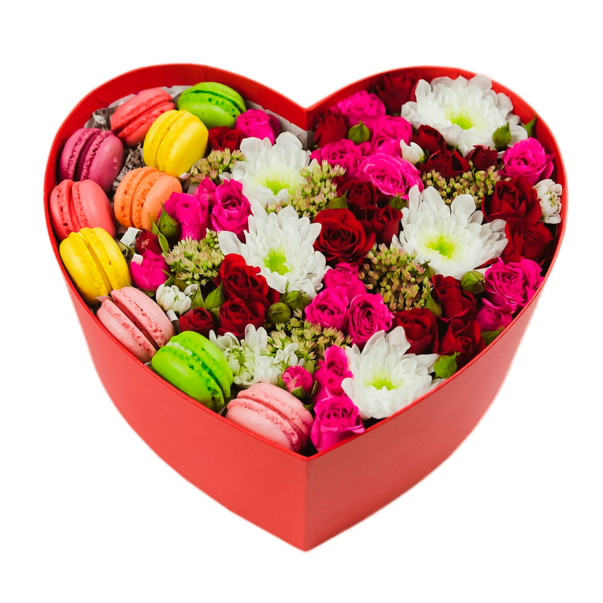 Яркая композиция из кустовых роз микс и белых хризантем создает атмосферу праздника. Упакована в красную коробку в форме сердца, добавляющую романтики. Возможны варианты оформления в бархатной или дизайнерской коробке. Прекрасный подарок для любимой на 14 февраля.