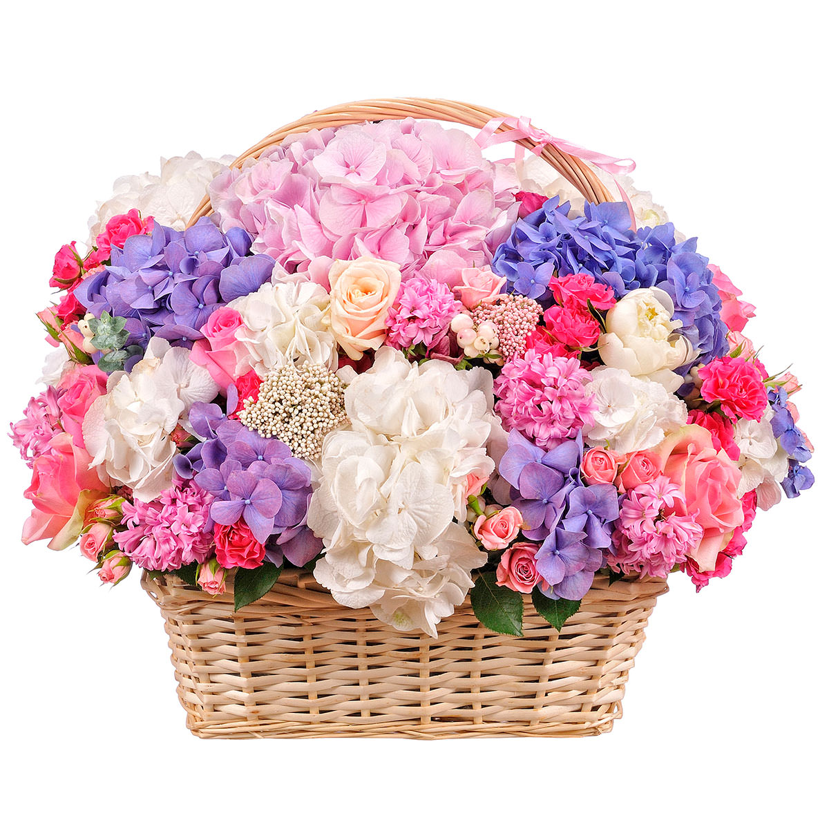Роскошная композиция из белых, розовых и фиолетовых гортензий, розовых кустовых и одноголовых роз, белых пионов и розовых гиацинтов, дополненная озотамнусом, создает атмосферу весеннего настроения. Корзина из лозы придаёт натуральный и элегантный вид. Возможны альтернативы оформления: корзина из ротанга или с тканевой отделкой. Прекрасный подарок для любимой на день рождения или годовщину.