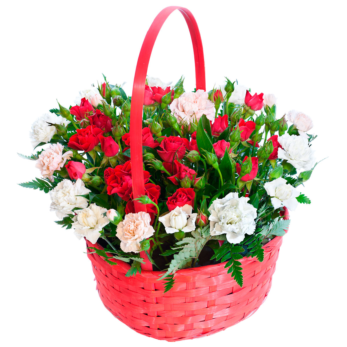 Эта изысканная цветочная композиция сочетает в себе красные кустовые розы и белые мини-гвоздики, создавая яркий контраст и утонченную элегантность. Корзина выполнена в красном цвете, что подчёркивает насыщенность букета. Альтернативно можно оформить в корзине из лозы или с тканевой отделкой. Прекрасный подарок для любимой на годовщину или день рождения.