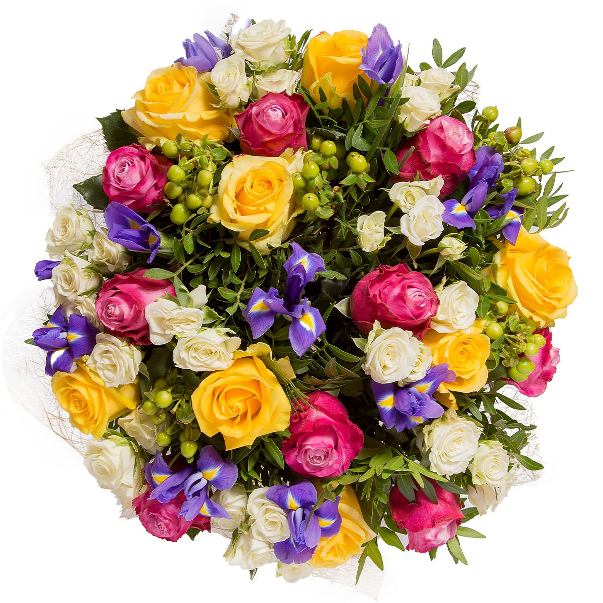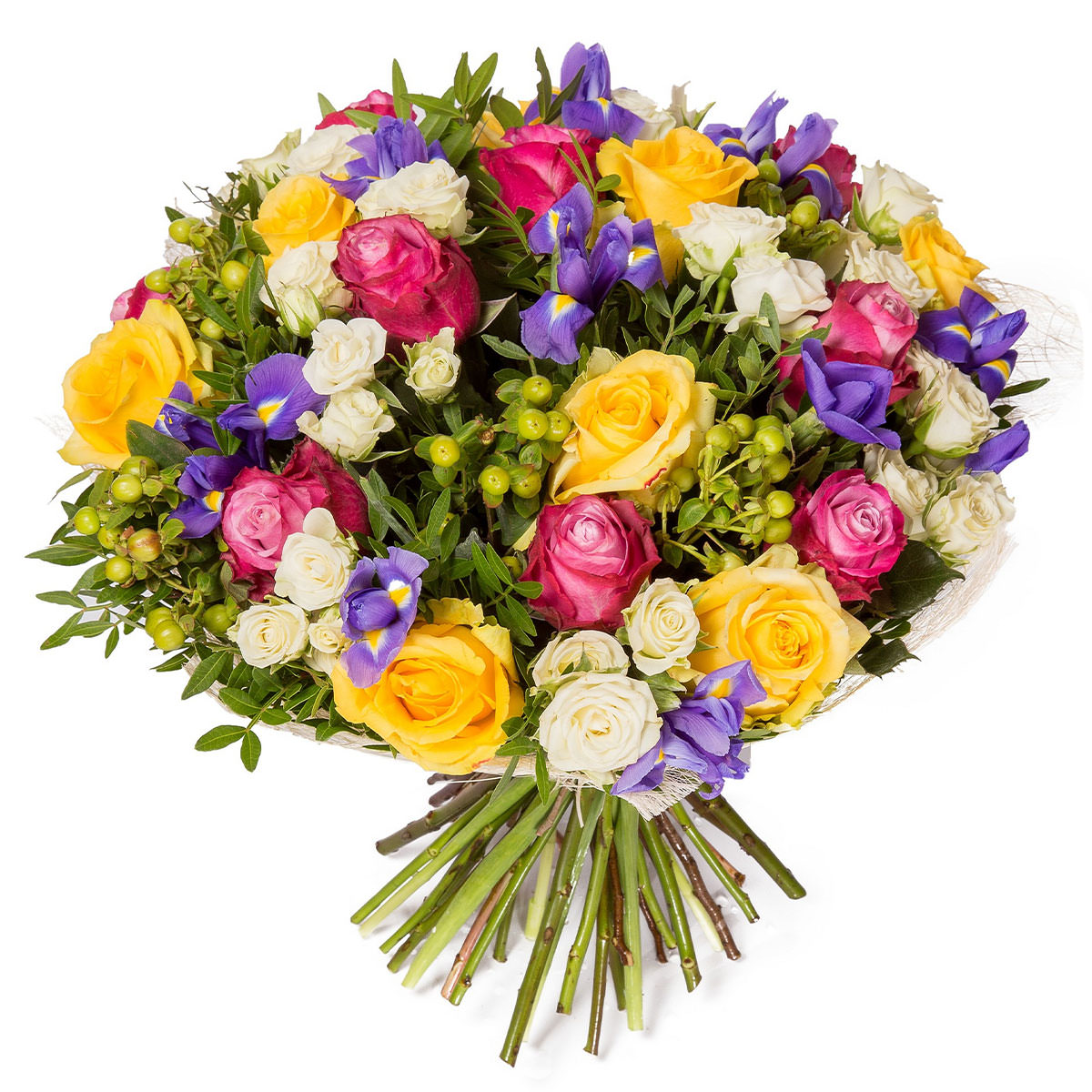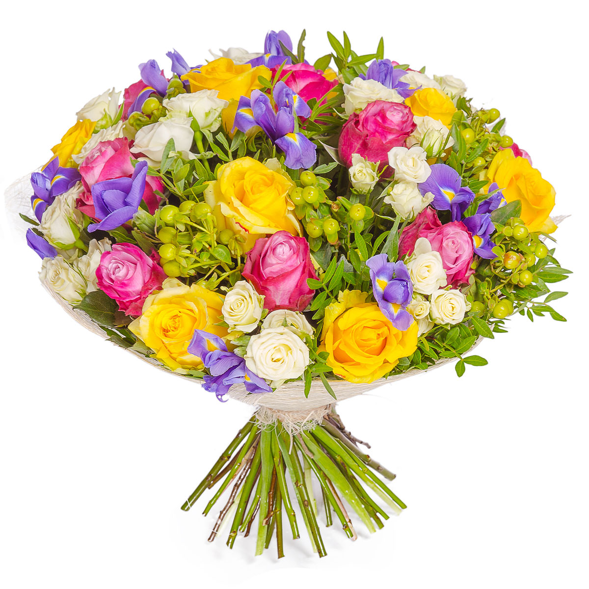 Яркий букет из желтых и розовых одноголовых роз, белых кустовых роз и фиолетовых ирисов, дополненных зеленью, создаёт атмосферу радости. Упакован в матовую пленку и перевязан лентой, он выглядит элегантно и стильно. Возможна упаковка в крафт-бумагу или декоративную сетку. Прекрасный выбор для поздравления на день рождения или для любимой.