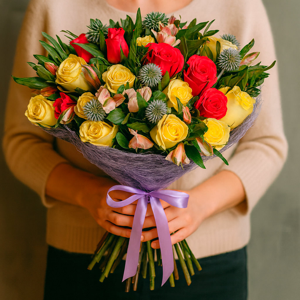 Яркие розовые и желтые одноголовые розы гармонично сочетаются с розовой альстромерией и экзотическим эрингиумом, создавая настоящий цветочный карнавал. Букет перевязан нежной лентой и упакован в матовую пленку, что придаёт ему изысканность. Возможны альтернативы оформления с использованием крафт-бумаги или декоративной сетки. Прекрасный подарок для любимой на день рождения или годовщину.