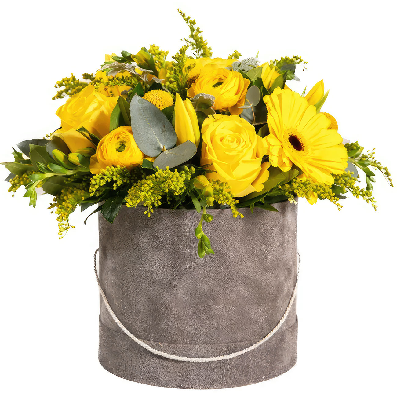 Яркое сочетание желтых роз, гербер, хризантем и ранункулюсов, дополненное свежестью эвкалипта и фрезий, создает атмосферу солнечного дня. Композиция оформлена в элегантной серой шляпной коробке, подчеркивающей насыщенные оттенки цветов. Возможны варианты оформления в бархатной или атласной коробке. Прекрасный подарок для любимой на день рождения или 8 марта.
