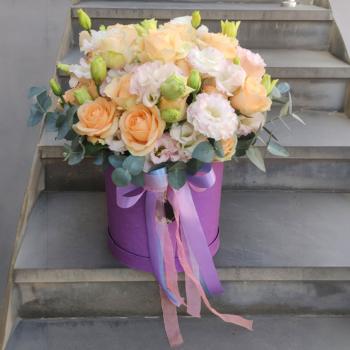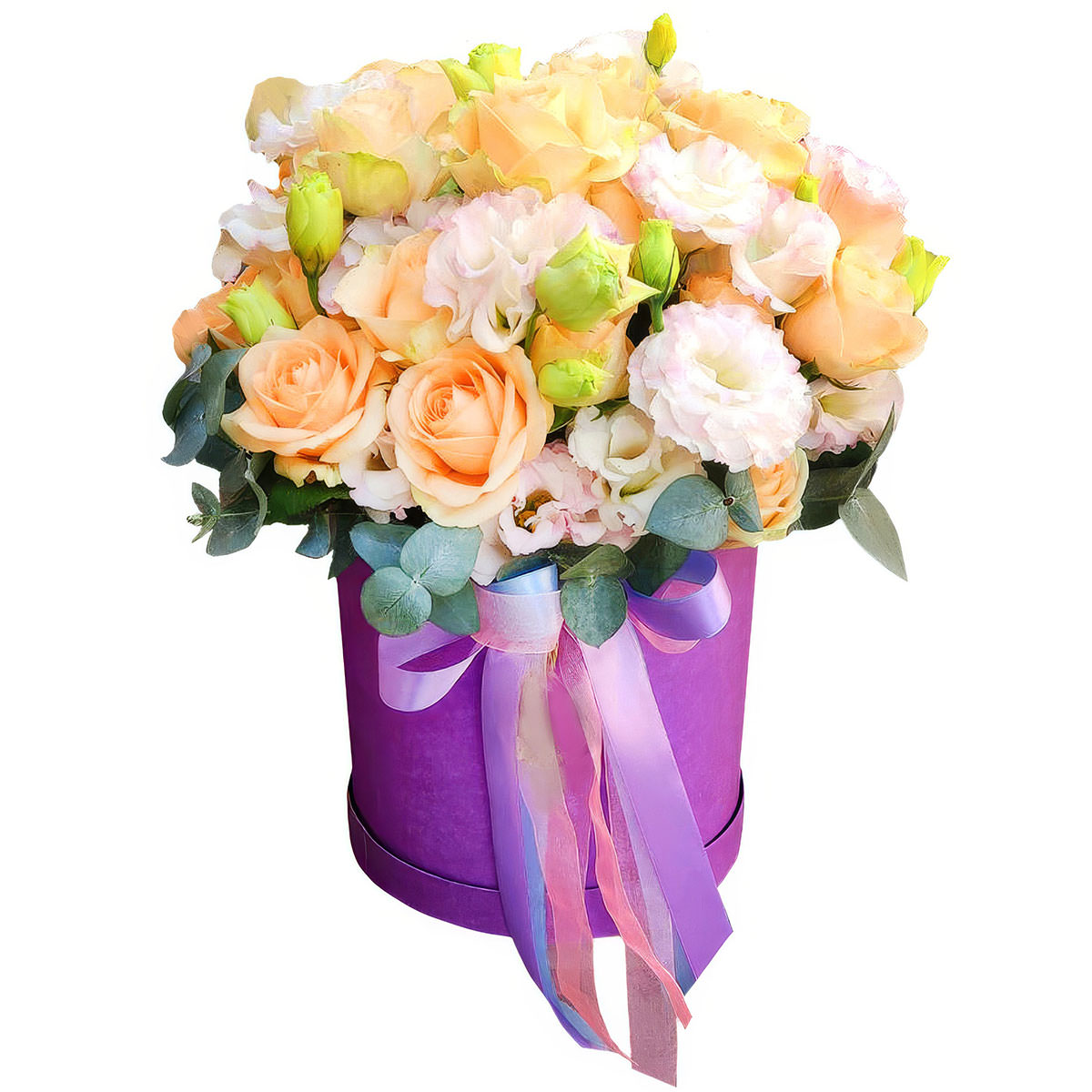 Изящная композиция из кустовых пионовидных роз в шляпной коробке фиолетового цвета. Нежные оттенки цветов подчёркивают утонченность и элегантность букета. Альтернативные варианты оформления: бархатная коробка или коробка с принтом. Прекрасный подарок для любимой на годовщину или день рождения.